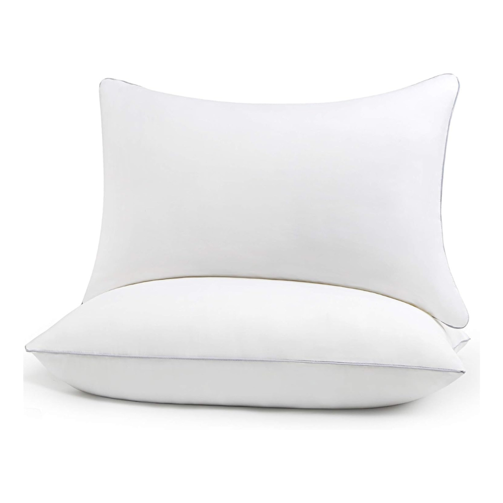 02 almohadas hechas de tela Algodón de 300 Hilos y rellena de Microfibra hipoalergénica con un cierre escondido para el fácil lavado y en los filos una vena satinada ploma para que le de esa elegancia y mayor durabilidad de un posible desarmado.